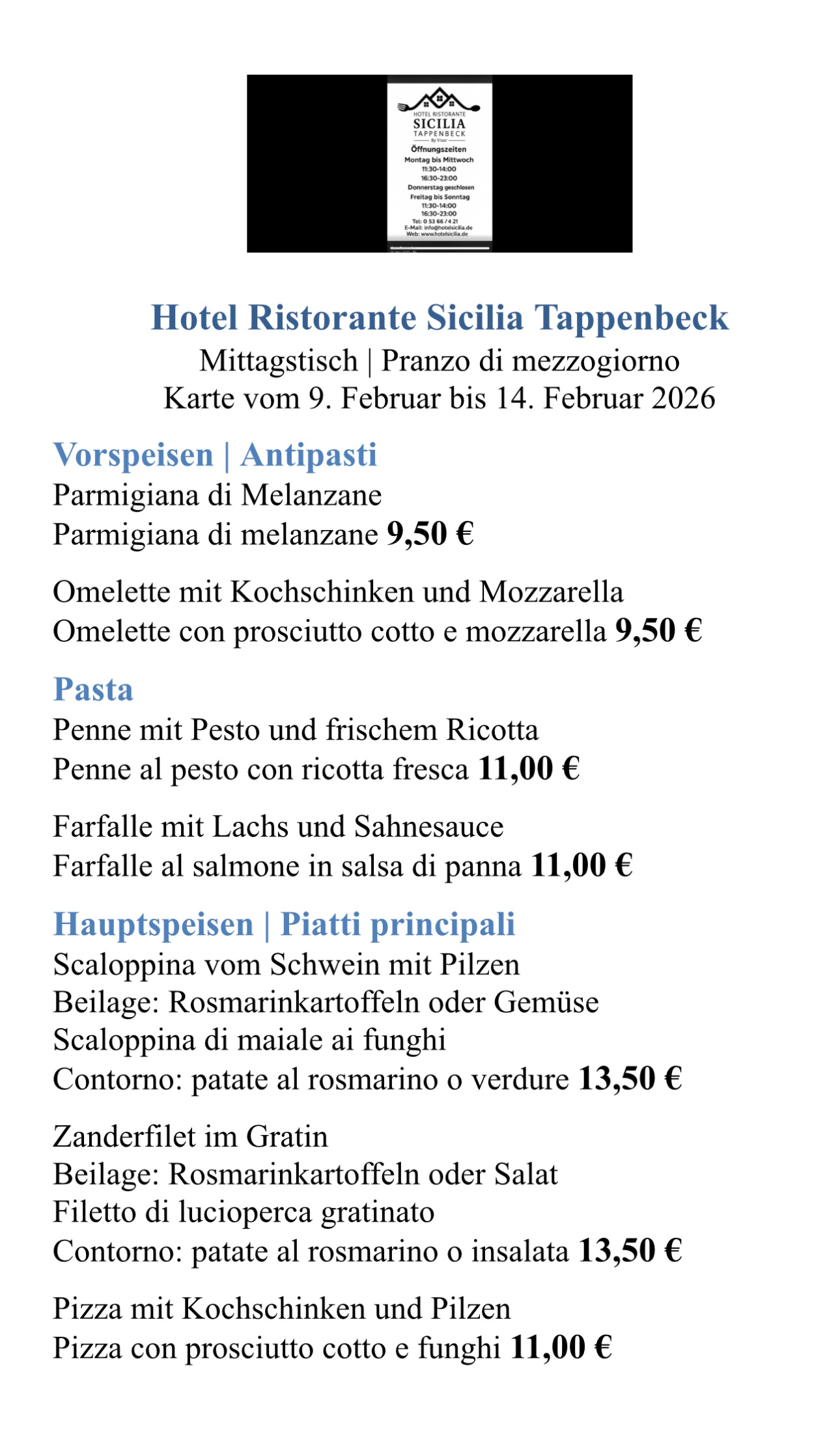 ab dem 9. Februar starten wir mit unserem Mittagstisch! Freuen Sie sich auf köstliche, frisch zubereitete Gerichte zu attraktiven Preisen. Unsere wöchentlich wechselnde Mittagskarte finden Sie montags bis freitags auf unserer Webseite sowie auf Instagram und Facebook. Für weitere Infos für die Mittagskarte Klicken sie unter : Unsere SpeiseKarte ,dort finden sie alle informatzionen